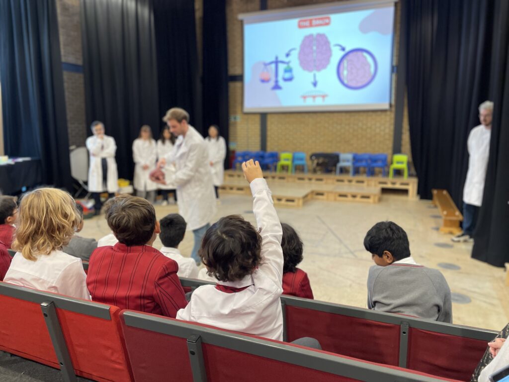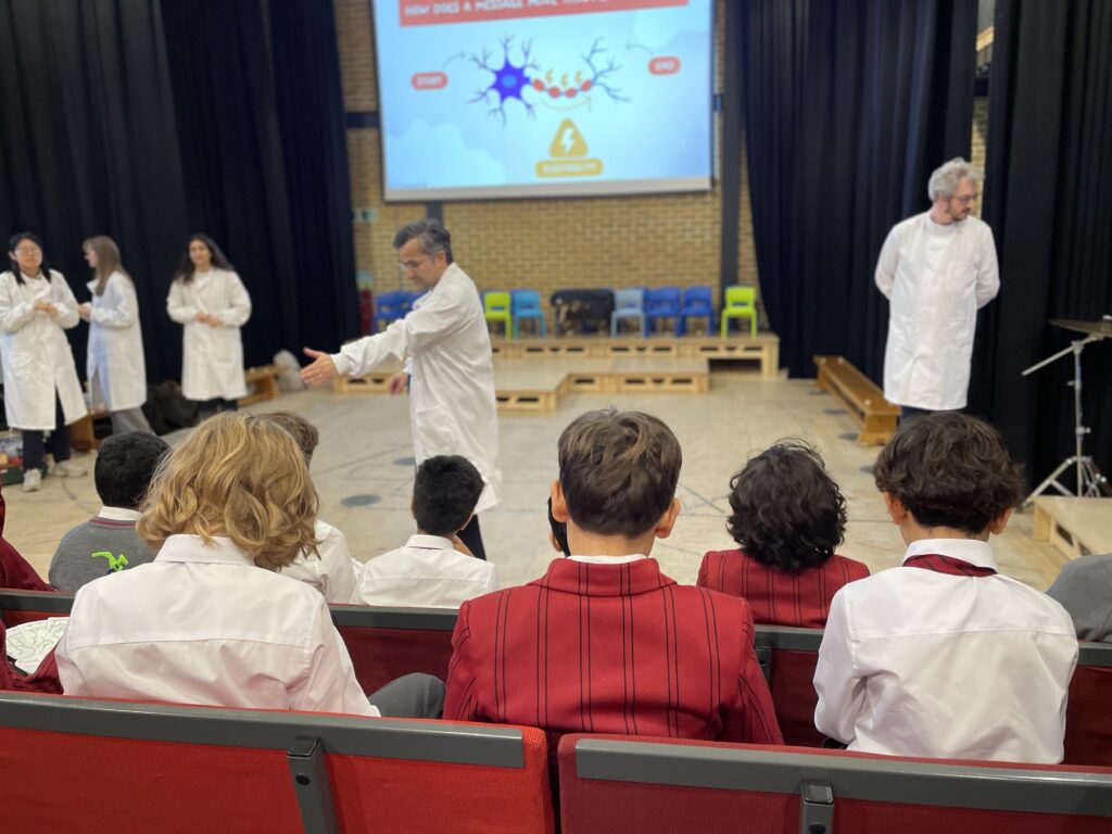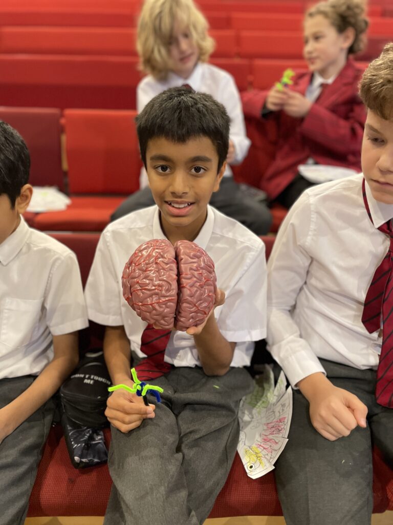 Year 5 and 6 pupils recently enjoyed a visit from a team of neuroscientists at King’s College London’s Wolfson SPaRC (Sensory, Pain and Regeneration Centre). The PhD students, researchers and lecturers discussed how the brain works, which parts of the brain are responsible for different bodily functions, senses and emotions, the parts of a neuron and how signals are transmitted via neuronal pathways.