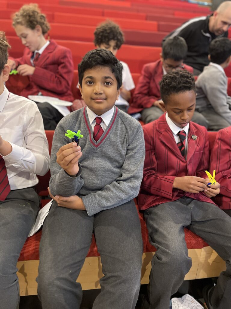 Once we’d learned about neurons, we made our own with three coloured parts, then worked out how signals are transmitted from one brain cell to another via electrical and chemical signals. The workshop finished with a pupil neuronal pathway game.